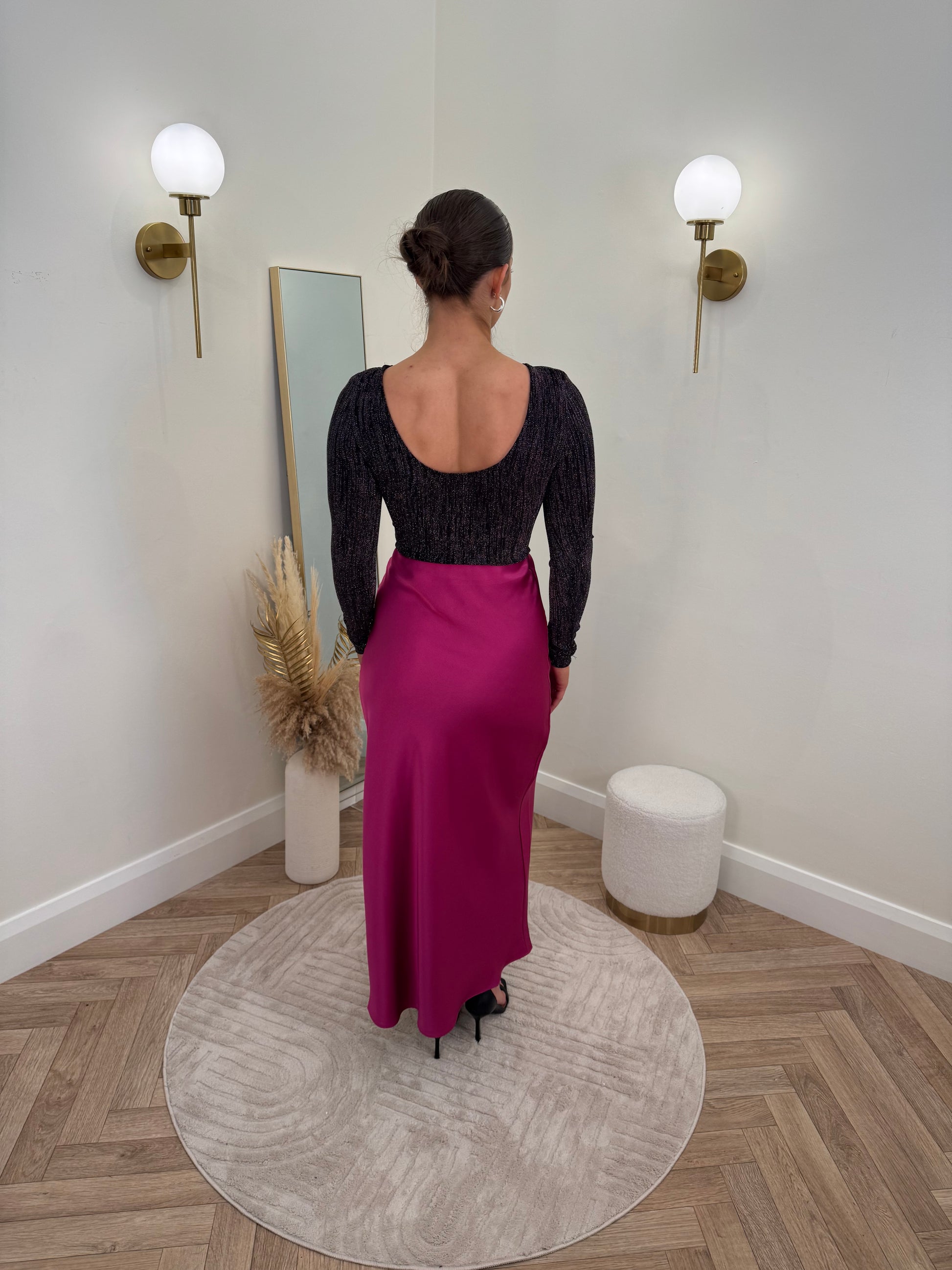 A chic long sleeve bodysuit top that will go with your fav jeans or skirt. A metallic print, scoop back, fitted shape for stunning weekend styling.