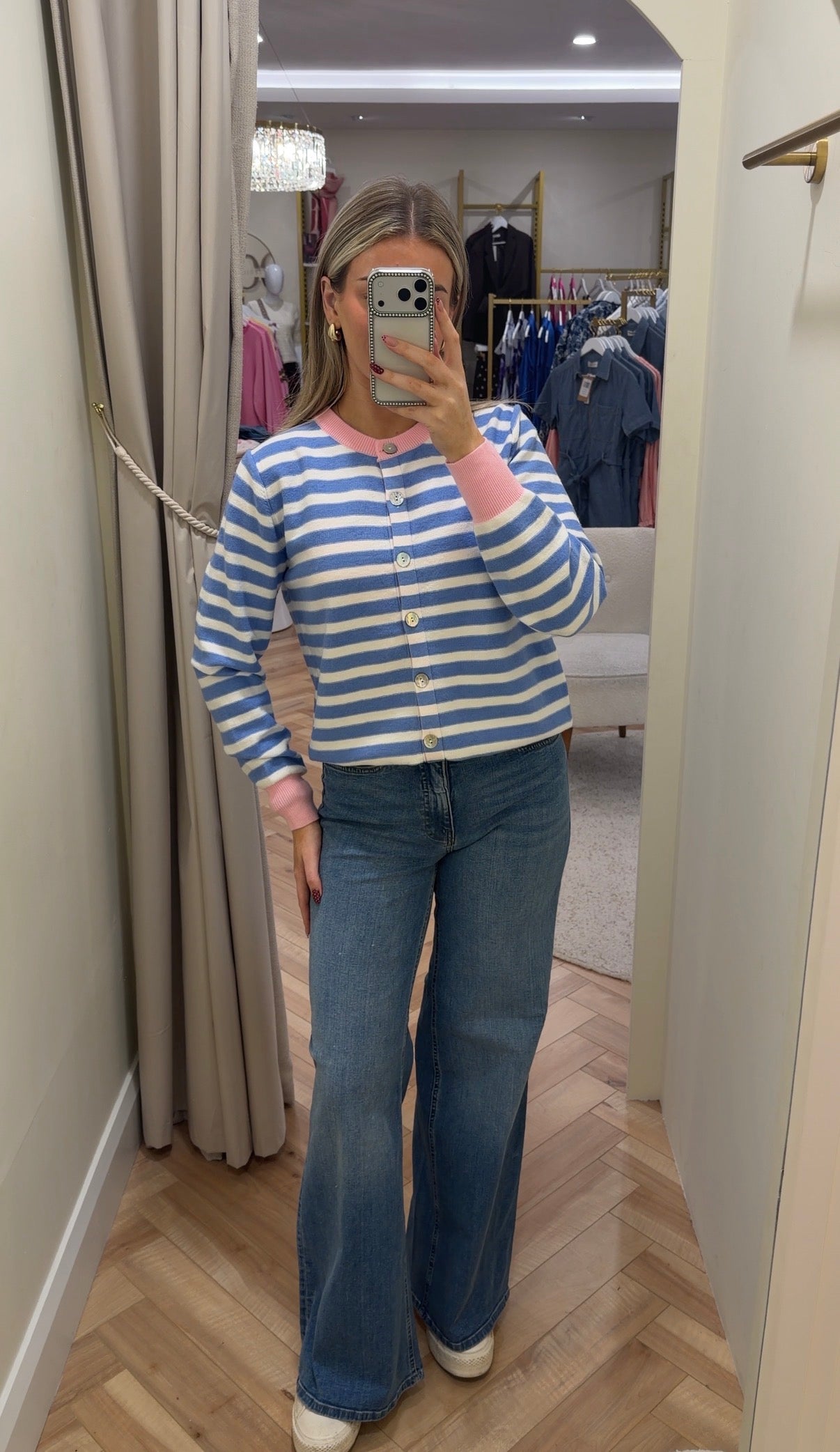 Soft fine knit cardigan featuring a stripe pattern with a pretty pink collar and cuff which adds a cute pop of colour