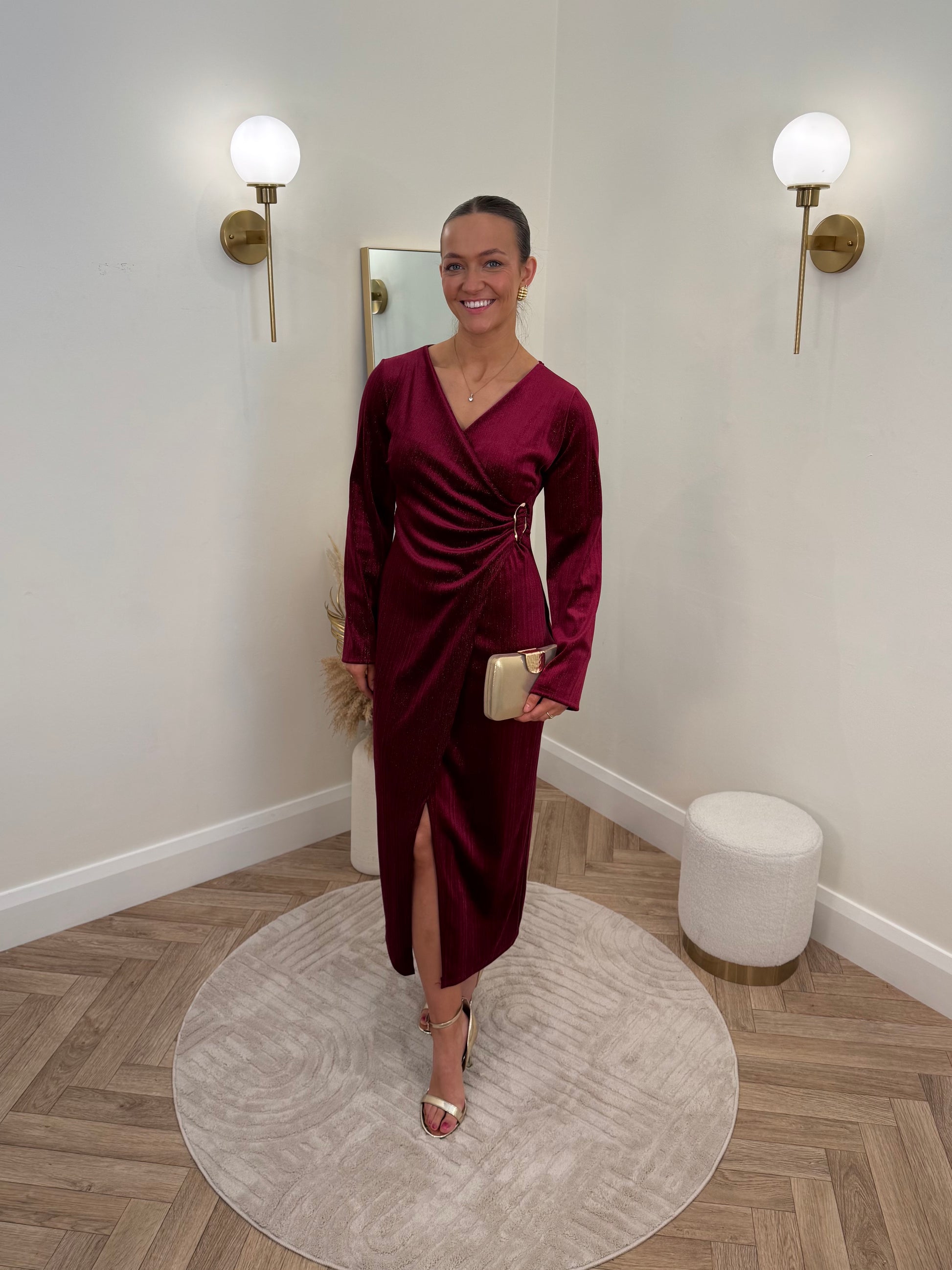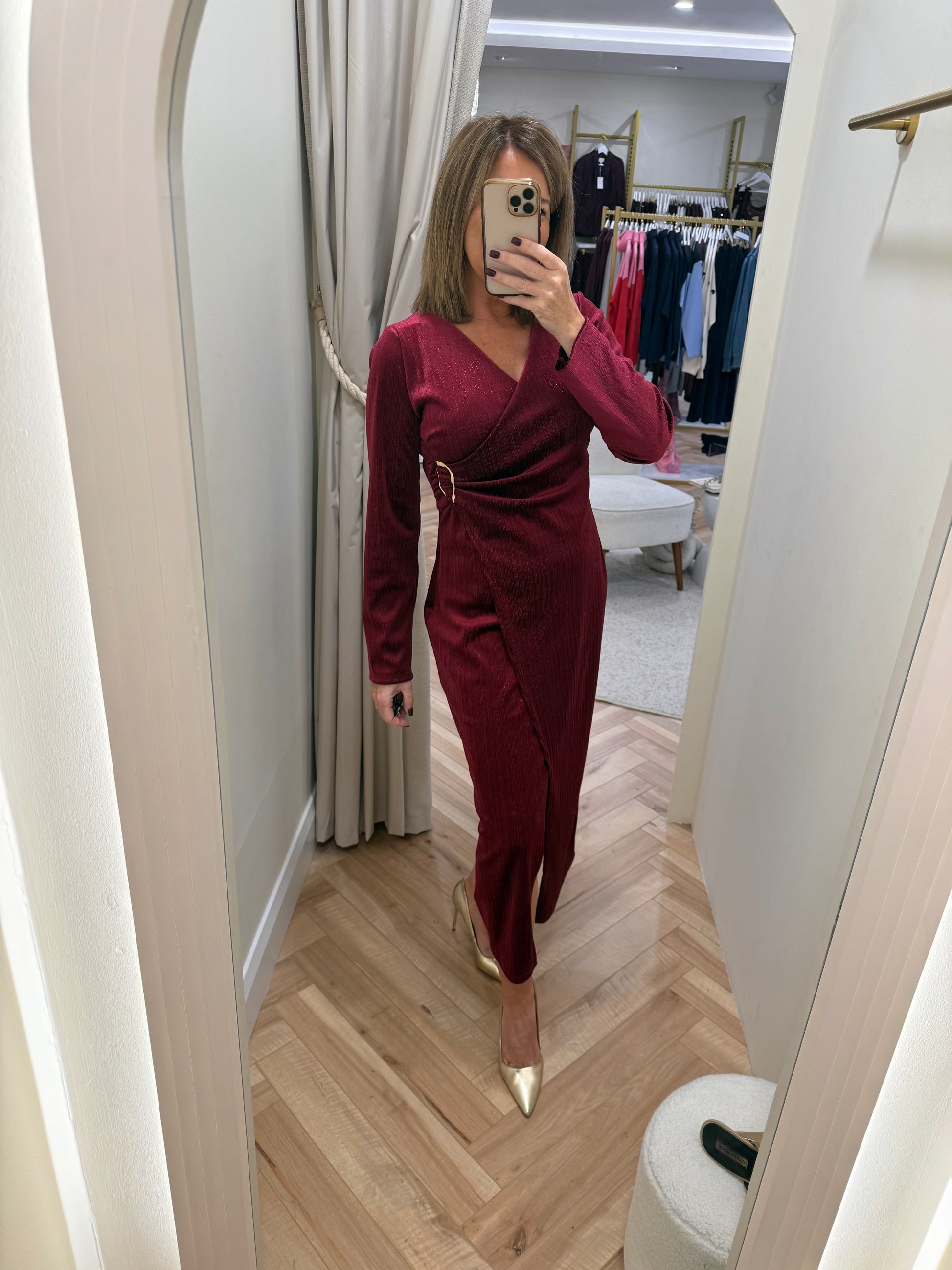 This gorgeous midi dress features a flattering v neckline, a subtle sparkle, side gold detailing elasticated back for extra comfort