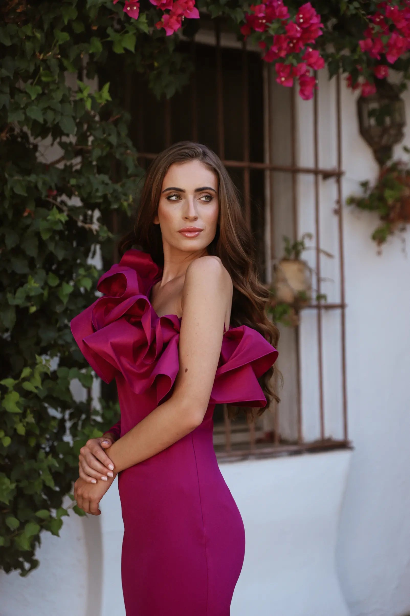 An asymmetrical midi dress with dramatic ruffles in vibrant eggplant colour. A single sleeve with stepped ruffles, asymmetrical neckline and asymmetrical back. Perfect for evening events, glamorous cocktails and galas.