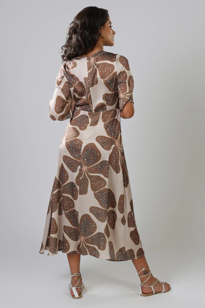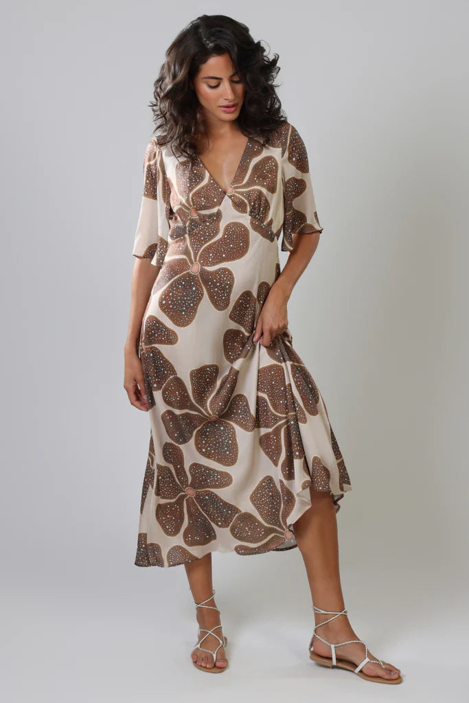 The Blythe Dress looks stunning in this bold cream and brown floral print. A gorgeous deep V-neck midi dress, with flattering gathering on the bust and mid length trumpet sleeves which float beautifully in the breeze. Fastened with a back zip. A perfectly versatile outfit which can be dressed up or down to suit any occasion.