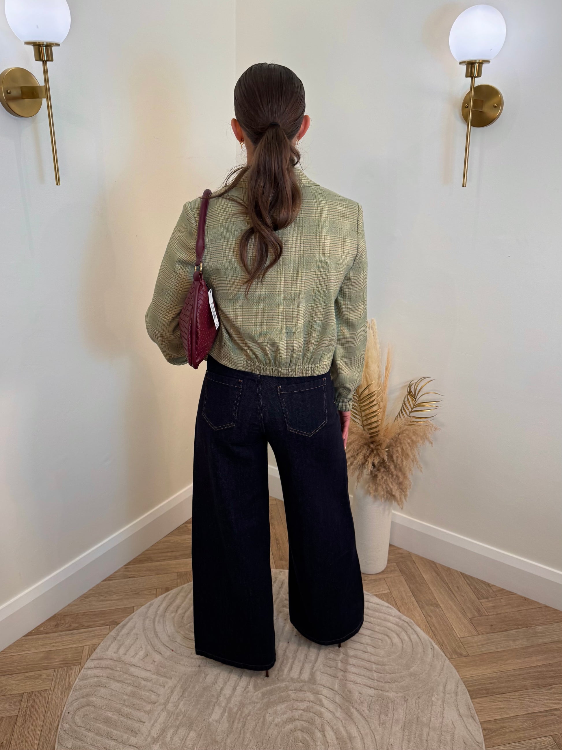 Cropped blazer with tailored fit, classic notched lapels, checked texture, single-button closure and front welt pockets. Modern elasticated cuffs add a relaxed edge.