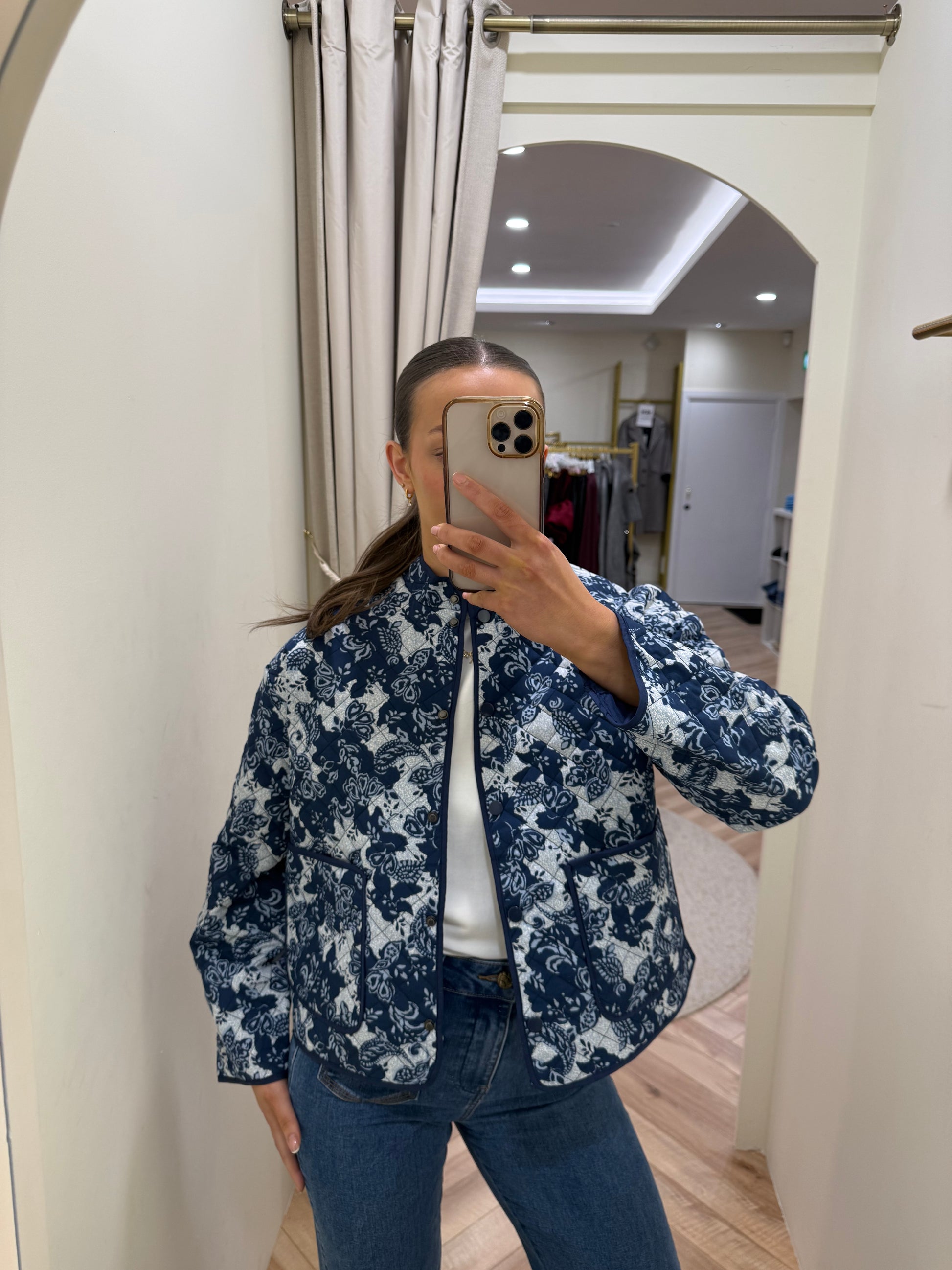 Ichi jacket in shades of blue. Abstract paisley print. Quilted fabric, lined in navy blue. Press stud fastenings. Front patch pockets with navy piping. Full length sleeves. Mandarin collar.