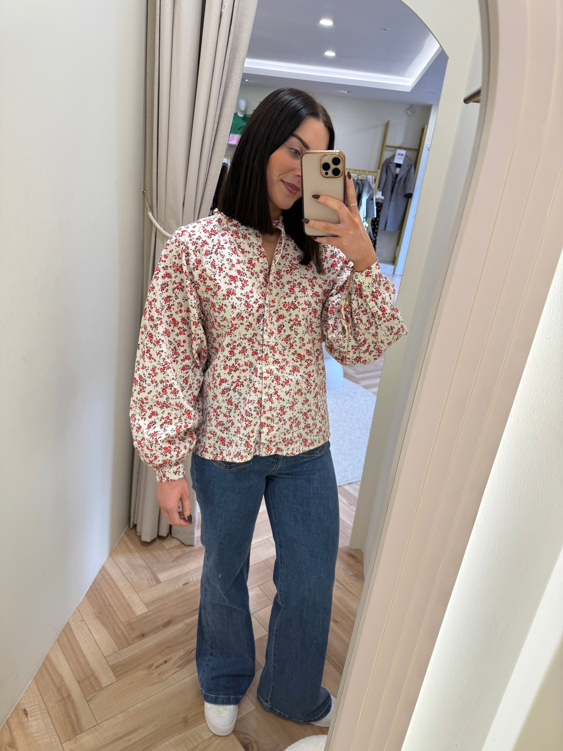 This blouse features a straight silhouette, high gathered neckline, and long sleeves with button cuffs. The lightweight texture ensures casual elegance and effortless comfort for everyday style.