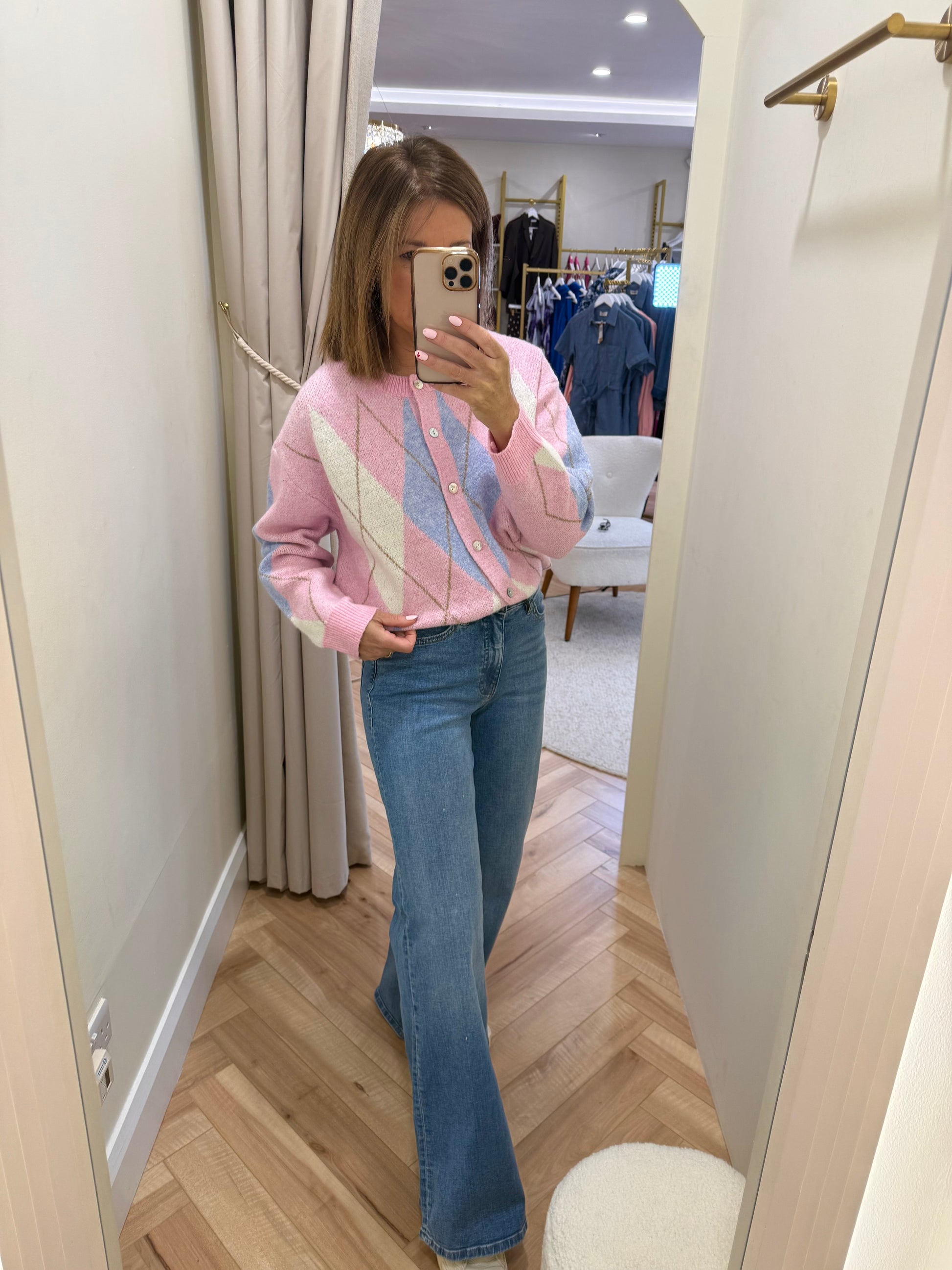 Add a touch of charm to your look with this adorable argyle cardigan in soft pink and blue.  Cozy, cute, and perfect for those effortlessly put together vibes