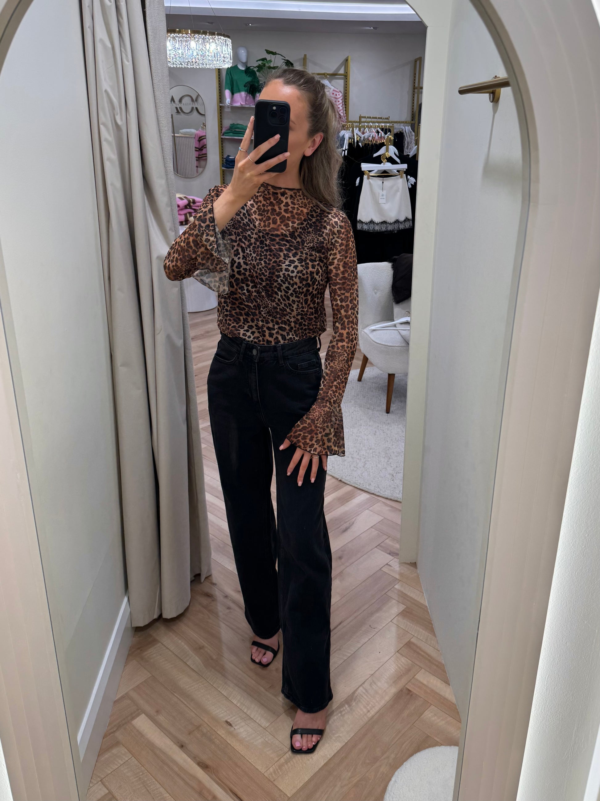 Lift your basics selection with this brown leopard-print top. It's made from fine mesh with a high neck and long fluted sleeves.