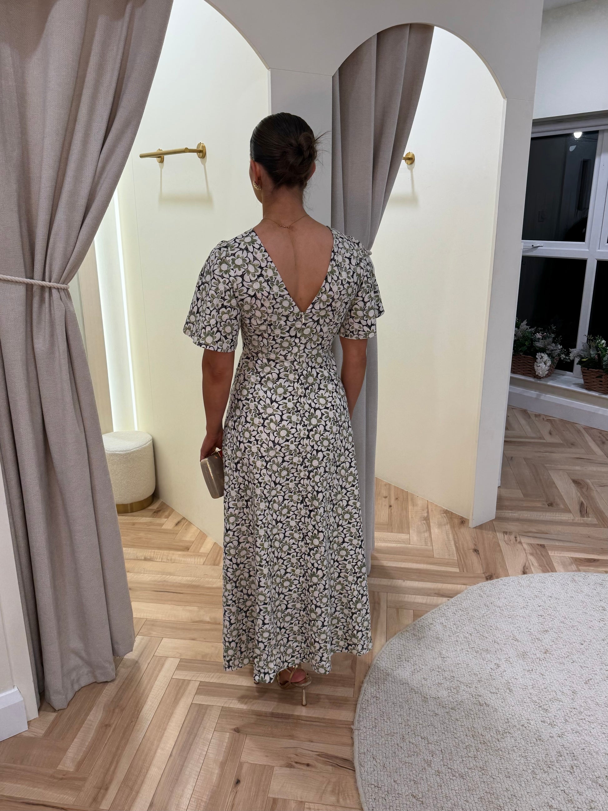 New spring/summer collection ~ Soft, light, and blooming with style! You'll never want to take Rene off again because you will enjoy your summer to the MAX(I) in this beauty! Her short butterfly sleeves and elegant V-back add a feminine touch while the flowy skirt sways beautifully with your every move. Made of supple viscose flaunting a floral print in green black on a cream-coloured background for breezy comfort.